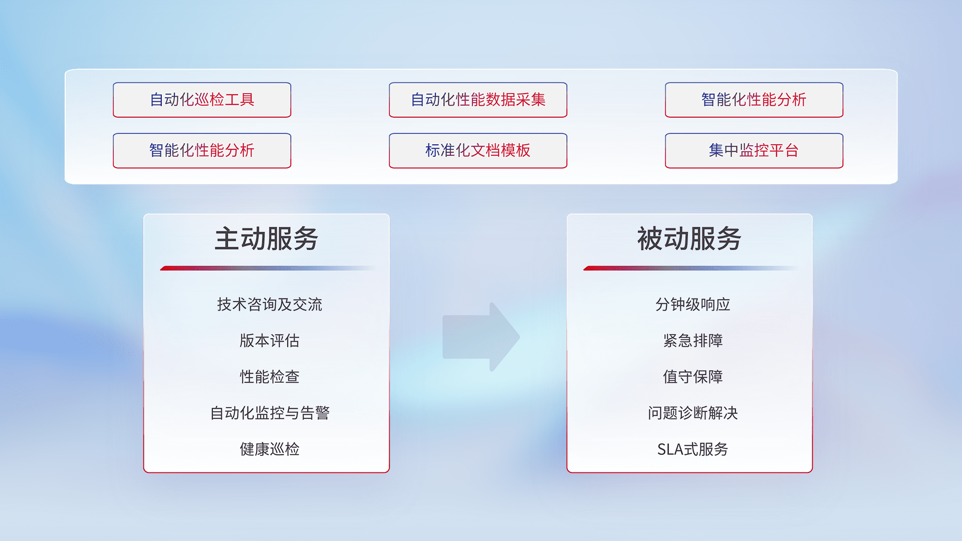 智能化工具和标准化文档,,保障服务质量,,提供主动服务(包含技术咨询、、、版本评估、、性能检查、、、、自动化监控与告警、、健康巡检)和被动服务包含(分钟级响应、、、紧急排障、、值守保障、、问题诊断解决、、、SLA服务)。。。。